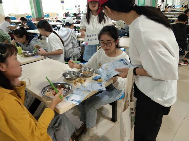 志愿者们在西区和南区食堂门口为进入食堂就餐的同学介绍本次活动的具体信息、节约的重要性,宣传《习近平:坚决制止餐饮浪费行为》要求精神,倡导同学们要以“光盘行动”为契机,养成勤俭节约的好习惯。在用餐区志愿者们以语言提示、“光盘监督”、卡通互动,发放“光盘行动”宣传单,签订“光盘行动,拒绝浪费”承诺书等形式传递勤俭节约信息。在食堂的收餐处,志愿者们为“光盘”的同学送上活动卡片,得到卡片的同学们都将有机会参与抽奖活动赢取奖品。