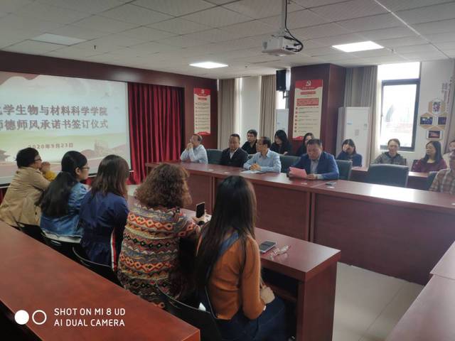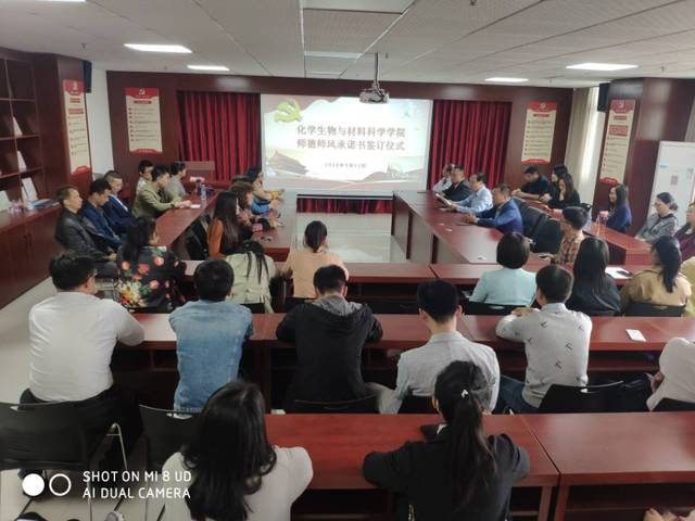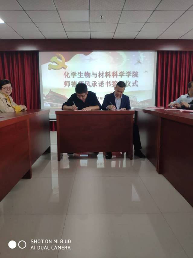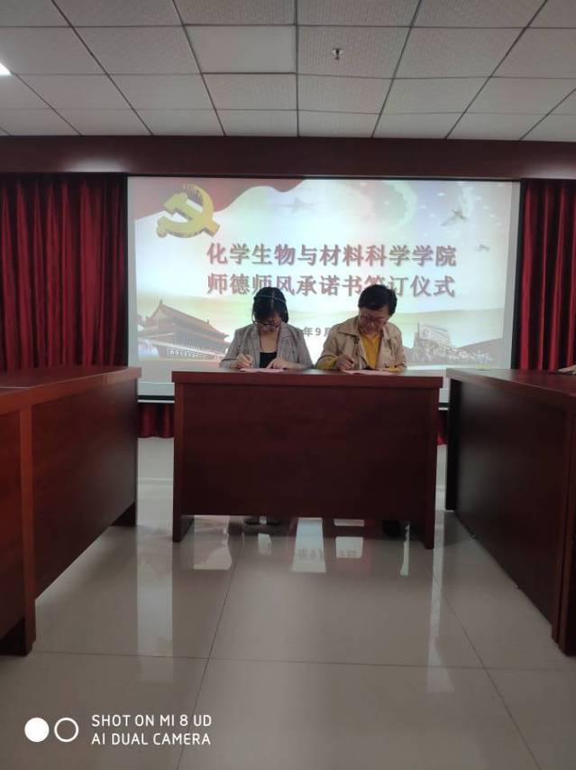 为进一步加强和改进师德师风建设,打造一支政治素质过硬、业务能力精湛、育人水平高超的高素质教师队伍, 化生材学院9月23日在核工楼604会议室举行了师德师风承诺书签订仪式。学院党委委员、各科室负责人和师生代表参加仪式。