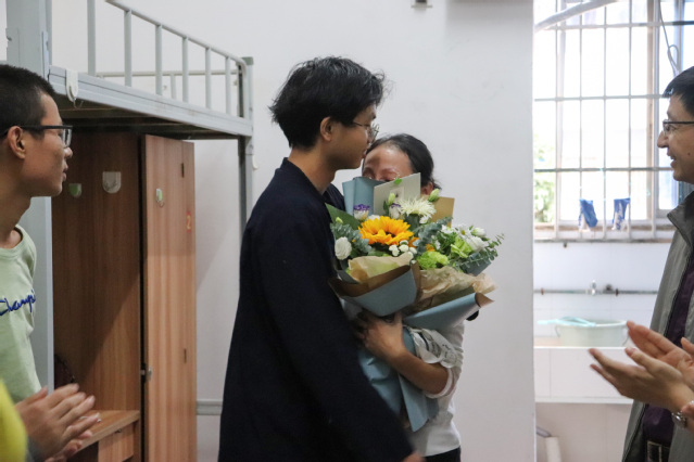 谁言寸草心,报得三春晖。生日既是每个孩子的降生之日,又是每个母亲的受难日。郭佳奕同学深谙这个道理,他收下鲜花后当即献给了自己的母亲。郭妈妈十分动容,与儿子紧紧拥抱在一起,并十分激动地感谢院领导、老师对孩子的关怀,同时希望自己的孩子能够好好学习,不负大家的期望。