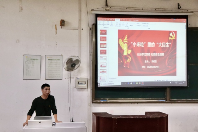 9月29日下午,师范学院在信工楼阶六教室开展了“优秀党员讲党课”主题党日活动,此次党课主题为“弘扬节俭美德,杜绝浪费粮食”,主讲人是学前教育专业学生党支部书记郭佳磊。师范学院全体学生党员、入党积极分子参加。