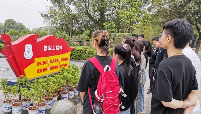 10月1日上午,核工学院新生代表在“核军工文化”木碑前列队,齐声诵读“核军工文化”的24字箴言:“核心意识,军人特质,工匠神韵,家国情怀,担当奉献,勇于创新”。在铿锵有力的诵读声中,深刻领会其精神内涵,进一步增强了专业学习兴趣,以及做一名东华理工核工人的自豪感和使命感。