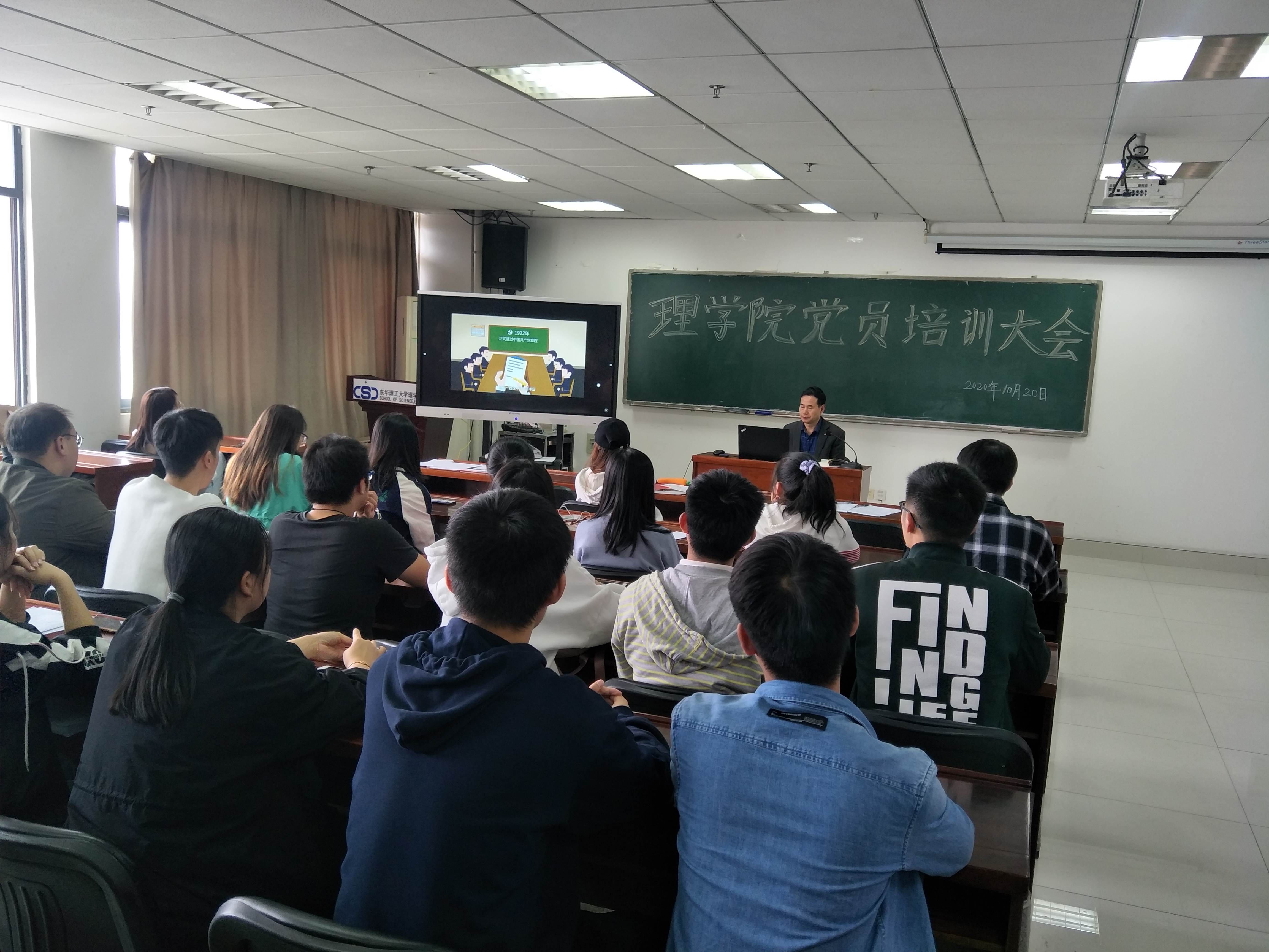 为贯彻落实中共中央《关于巩固深化“不忘初心、牢记使命”主题教育成果的意见》,按照《2019-2023年全国党员教育培训工作规划》规定,根据校党委组织部的统一部署,理学院党委安排了全院党员的集中培训工作。2020年10月20日下午,理学院党委组织全院教工、学生党员在核工楼1216报告厅开展了第一次集中培训工作,本次培训由理学院党委书记王勇主持。