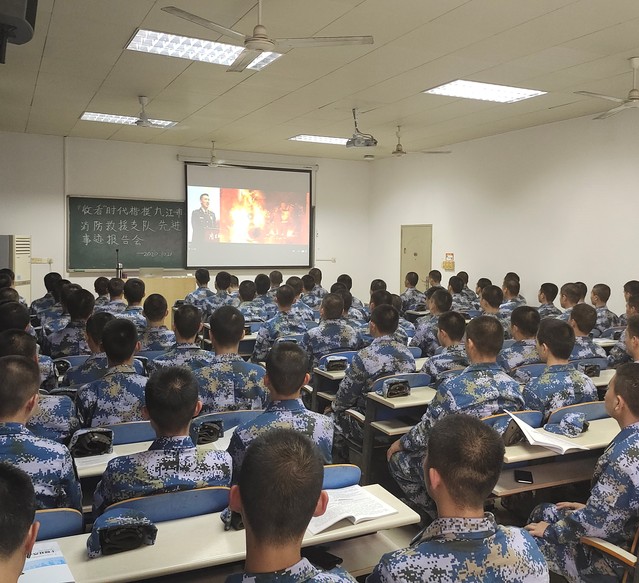 为学习时代楷模,传承榜样精神,10月21日下午3点,国防教育学院组织海军定向培养士官在学府校区一号教学楼309教室收看报告会直播,全体老师在学院党员活动室同步收看。