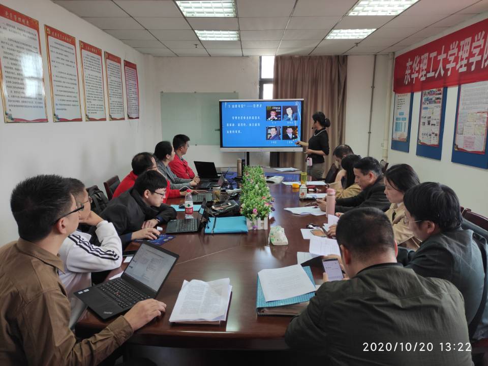 为全面推进课程思政建设,落实立德树人根本任务,强化课程育人导向,挖掘和丰富课程育人内涵,改革教学内容和教学方式,2020年10月20日,理学院首届课程思政教学竞赛在核工楼1219室举行。副院长李迎主持会议,学院督导组教师及各系部主任担任竞赛评委。理学院青年教师积极参加了竞赛。在竞赛过程中,各位参赛教师在教学设计、教学展示等环节表现出了良好的业务能力和水平。