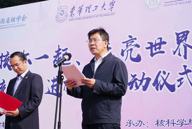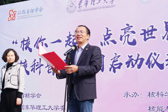 汤彬在讲话中指出,科技创新、科学普及是实现创新发展的两翼,只有全民科学素质普遍提高,才能建立起宏大的高素质创新人才队伍,才能实现科技成果快速转化。东华理工大学将一如既往的坚持通过科普讲座、学术研讨、社会实践、学科竞赛等多种方式开展核科普教育活动,引导大学生主动走进核科学世界,宣传核科学技术的创新发展及其在推动经济社会发展中的作用,不断提升公众对核科技创新成果的认知度。他勉励青年大学生要努力学好先进科学文化知识,争做科学文化知识的“传播使者”,在学习实践中强化科学思维意识、提升科学思维能力,着力练就过硬本领、锤炼高尚品格,矢志艰苦奋斗、勇于开拓进取,用青春和奋斗谱写人生华美篇章。
