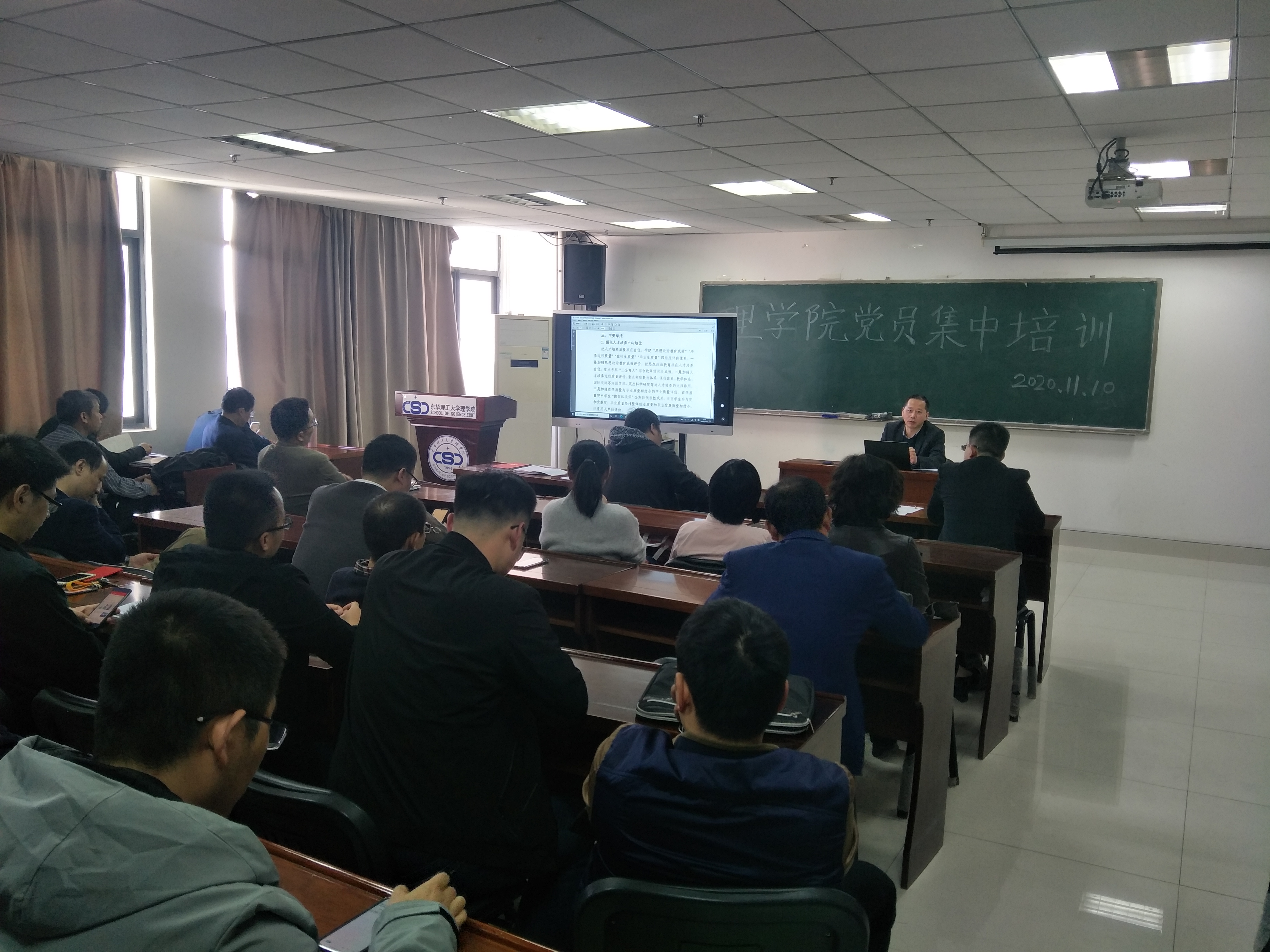 为贯彻落实中共中央《关于巩固深化“不忘初心、牢记使命”主题教育成果的意见》,按照《2019-2023年全国党员教育培训工作规划》规定,根据校党委组织部的统一部署,2020年11月10日下午,理学院党委组织全院教工党员在核工楼1216报告厅开展了第四次集中培训工作,本次培训由理学院党委委员、院长王泽文主持。