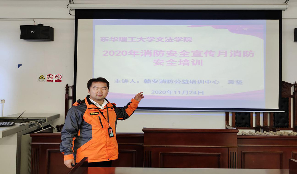 2020年11月24日下午2点,文法学院消防安全知识讲座在文法楼507室如期举行。学院邀请赣安消防公益培训中心袁坚教官前来主讲,学院党政领导班子和全院教师共60余名参与了此次讲座。