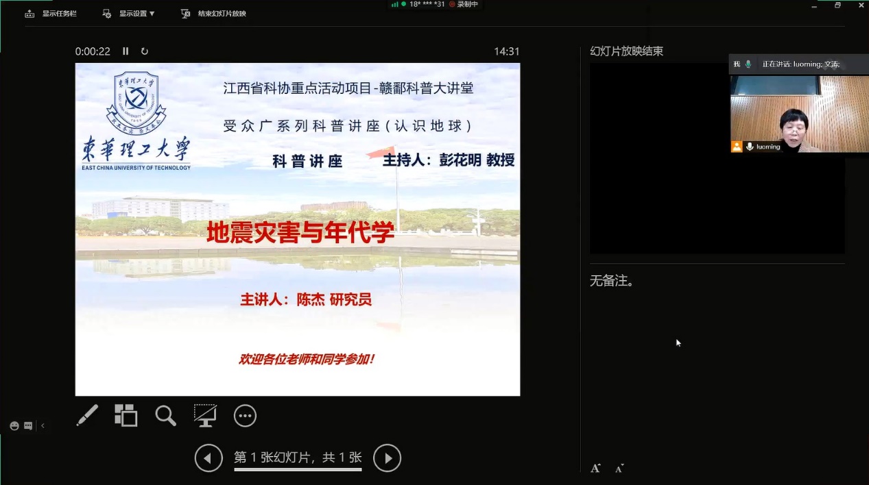 2020年11月26日,东华理工大学研学实践教育基地开展了江西省赣鄱科普大讲堂活动,特邀请中国地震局地质研究所的陈杰研究员为大众讲解地震知识。此次线上科普活动以“地震灾害与年代学”为主题。