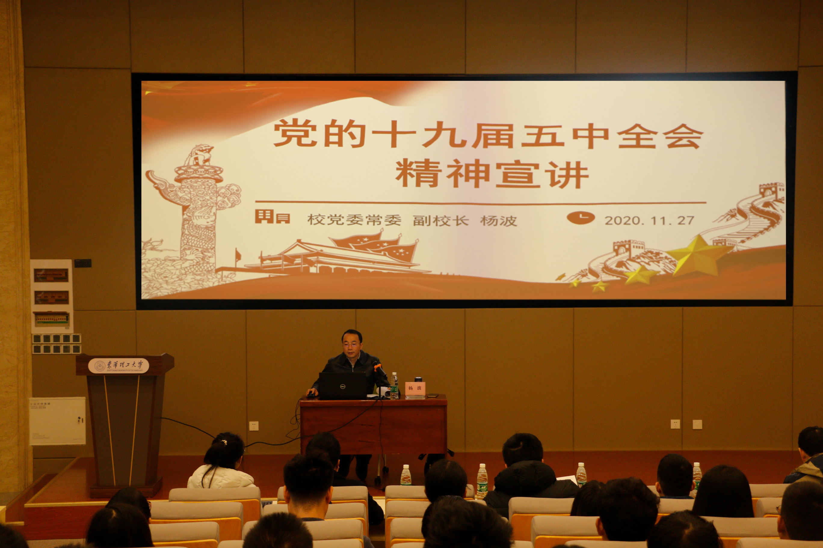 11月27日下午,为了深入学习和贯彻落实党的十九届五中全会精神,校党委常委、副校长杨波同志深入基层宣讲党的十九届五中全会精神,为大家开展专题辅导。理学院、文法学院、校办、研究生院、保卫处、国际合作与交流处以及各学院党支部书记、学生代表参加宣讲会。