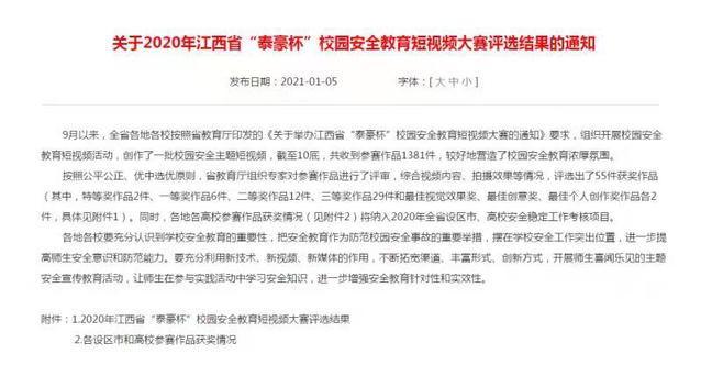此次大赛以校园安全为主题,将校园安全中如防溺水、心理健康、消防安全等通过短视频的形式展现出来,创新校园安全教育形式,增强安全教育针对性和实效性。项目经初步筛选、专家评审等环节,共评出特等奖2项,一等奖6项,二等奖12项,三等奖29项、单项奖6项。各高校参赛作品获奖情况将纳入2020年全省设区市、高校安全稳定工作考核。