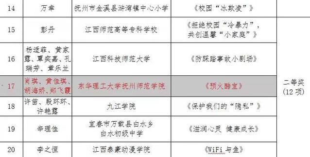 近日,由江西省教育厅主办的首届江西省“泰豪杯”校园安全教育短视频大赛评选结果正式公布,师范学院报送的由肖琪等四位同学完成的参赛作品《预火酷宝》从1381件作品中脱颖而出,荣获二等奖,也是我校唯一一件获奖作品。