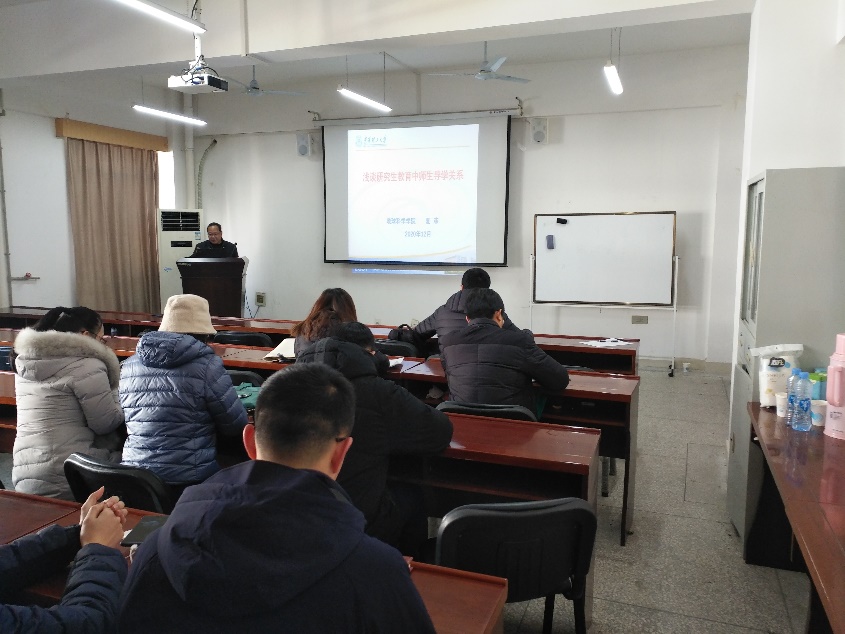 东华理工大学组织部部长夏菲教授做了浅谈研究生教育中师生导学关系的培训,具体包括何谓和谐育人型导生关系、和谐育人型导生关系的特点和导生关系的建议。导师与研究生不仅要在学术上有指导与交流,同时也要在生活、交友、运动等方面也有交流,是一种以导师和研究生全面互动为主的和谐育人关系。导师要关爱学生的身心健康、关心学生的学业进展、关注学生的思想动态,最终成为学生的人生引领。