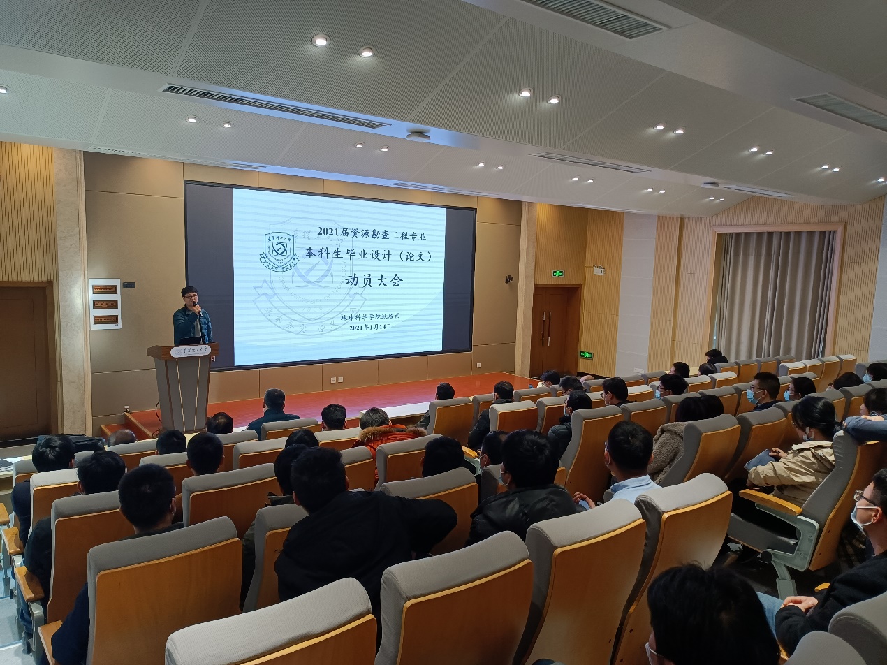 为推进2021届毕业设计(论文)工作,2021年1月14日下午,地球科学学院在第四教学楼阶十九报告厅召开了2021届资源勘查工程专业本科生毕业设计(论文)指导教师动员大会。地球科学学院院长许德如、副院长时国、基础地质教学部、地质系和地质研究所负责人及全体2021届资源勘查工程专业毕业设计(论文)指导教师参加了本次动员大会。动员大会由地质系主任李增华主持。