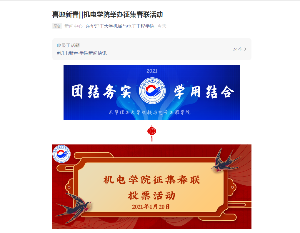 此外,机电学院通过微信公众号平台向学院全体老师征集凸显学院特色的春联,选择投票数多,人气最高的一副予以奖励。经过激烈角逐,最终徐英帅老师获奖。