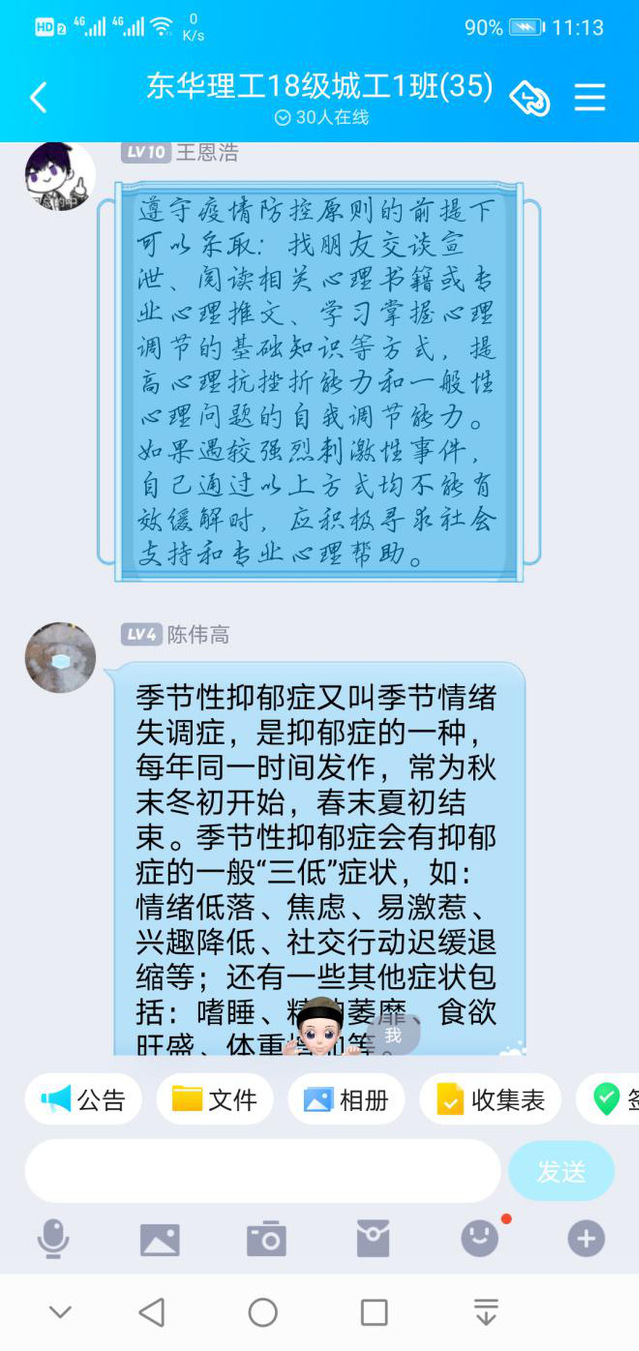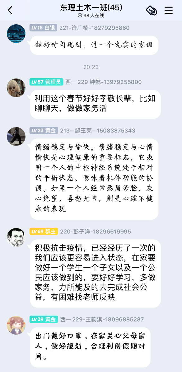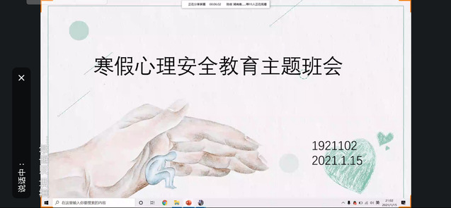 开展话题讨论,加强自我认知。部分班级还选取了与学习、生活相关的话题展开线上班级讨论。1821101班关于“假期心理规划”话题讨论,邀请同学们计划自己在寒假期间的目标。1921102班以“心理安全教育”为班会主题帮助同学们进一步认识到情绪对个体的重要性。在活动过程中,不仅加深了本班同学对心理健康知识的理解,还有助于引导同学们更好地规划学业与生活。
