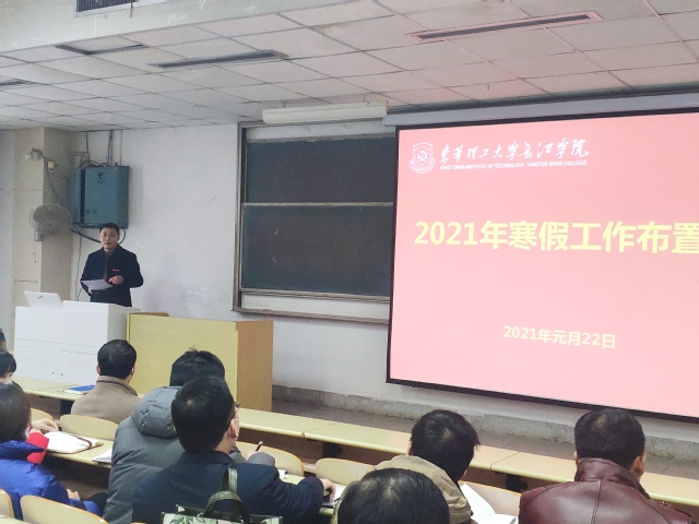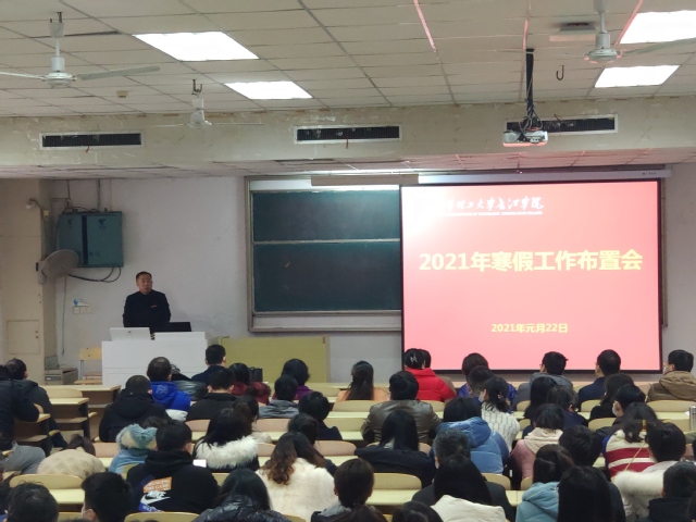 会上,陈泉水传达了东华理工大学2021年寒假工作布置会精神,要求学院各部门结合实际组织开展相关工作,真正做到“放假不放松”“休假不休工”。其次,就寒假期间的重点工作作了具体部署:一是各系要积极动员大学生参军入伍,为国奉献。二是全院教师要按时按质完成本学期的教案讲稿整理、成绩录入等相关工作。三是各系部要高度重视网络舆情工作。四是辅导员、班主任要加强学生的疫情防控工作,督促学生坚持每天在支付宝打卡。五是院团委、工会要采取灵活多样的方式,组织师生积极参加有益身心健康的活动,共同抗疫。
