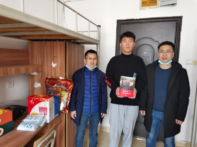 走访中,金建华向留校学生表达了学院对留校学生的关心,代表学院送去了《习近平与大学生朋友》《平凡的世界》等励志书籍、牛奶以及口罩等物资,检查了宿舍的环境卫生和安全状况。金建华与留校学生深入交谈,详细询问了留校期间健康、心理、生活和学业状况,鼓励留校学生在寒假期间充分利用学校的良好条件,合理安排时间,保持良好的学习、生活习惯,努力提升自我;随行老师们叮嘱继续做好科学防护,增强卫生健康意识,适量运动、保障睡眠、不熬夜,放心留校、安心学习、舒心生活、开心过年,加强与家里的联系互动,有任何困难和问题及时联系学院寻求帮助。