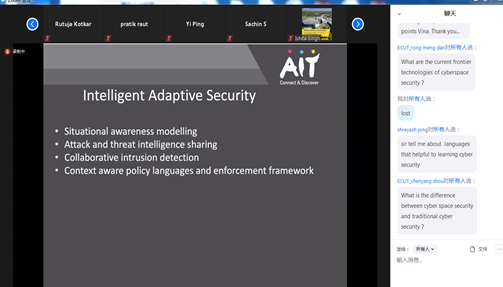 Brian Lee首先介绍了AIT在网络空间安全方面的研究方向,着重展示了人工智能技术以及区块链技术在网络安全方面的应用。他强调,AIT在网络技术方面有着较强的研究实力,欢迎全球研究者交流合作。随后,Enda Fallon介绍了AIT在信息通信技术(ICT)方面的产学研合作情况,并就相关课程设置做了简介。在答疑环节,我校荣梦丹、周晨阳等同学就网络空间安全相关问题积极提问,并获得了满意答复。