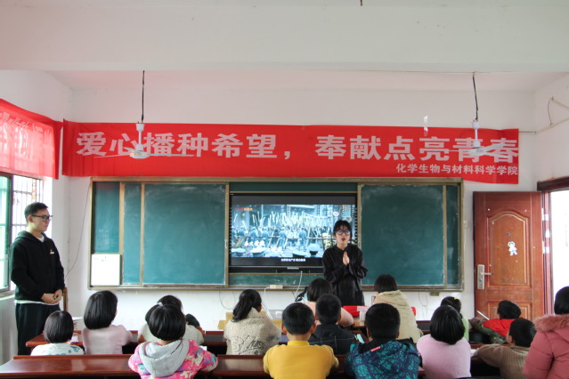 播撒梦想 关爱成长 3月13日上午志愿者们来到徐家村小学开展爱心支教活动。志愿者们给小学生们播放了我校优秀红色视频作品《20岁的我们,20岁的他们》以及人民日报日前发布的为了庆祝建党100周年而改编制作的歌曲《少年》,孩子们看完热血澎湃,畅谈理想,并立志要为祖国美好明天而努力学习。志愿者们还结合所学专业,给孩子们带去了一堂生动有趣的化学实验课,让孩子们对化学产生了浓厚的兴趣。课后,志愿者们带着孩子们开展了益智游戏,校园里满是欢声笑语。