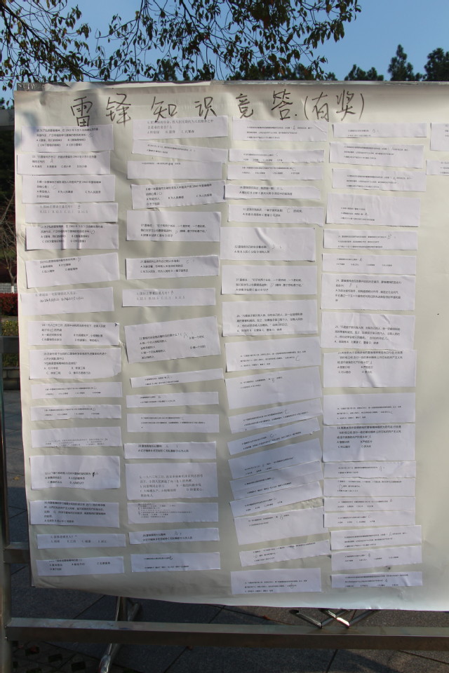 为进一步推动“雷锋月”活动深入开展, 3月14日我院青志协在青春广场开展了“爱心播种希望,奉献点亮青春”学雷锋知识有奖竞猜活动。同学们抽取题目后答题,工作人员将答对的题目贴在展板上供路过的同学学习,没有答对的题目则被投入答题箱继续等待下一位同学抽取,直到答对被贴出。知识竞答形式让同学们重温习近平总书记关于雷锋精神的重要指示精神,使雷锋精神常学常新。活动结束后,同学们还在留言纸上写下了自己对雷锋精神的感悟。