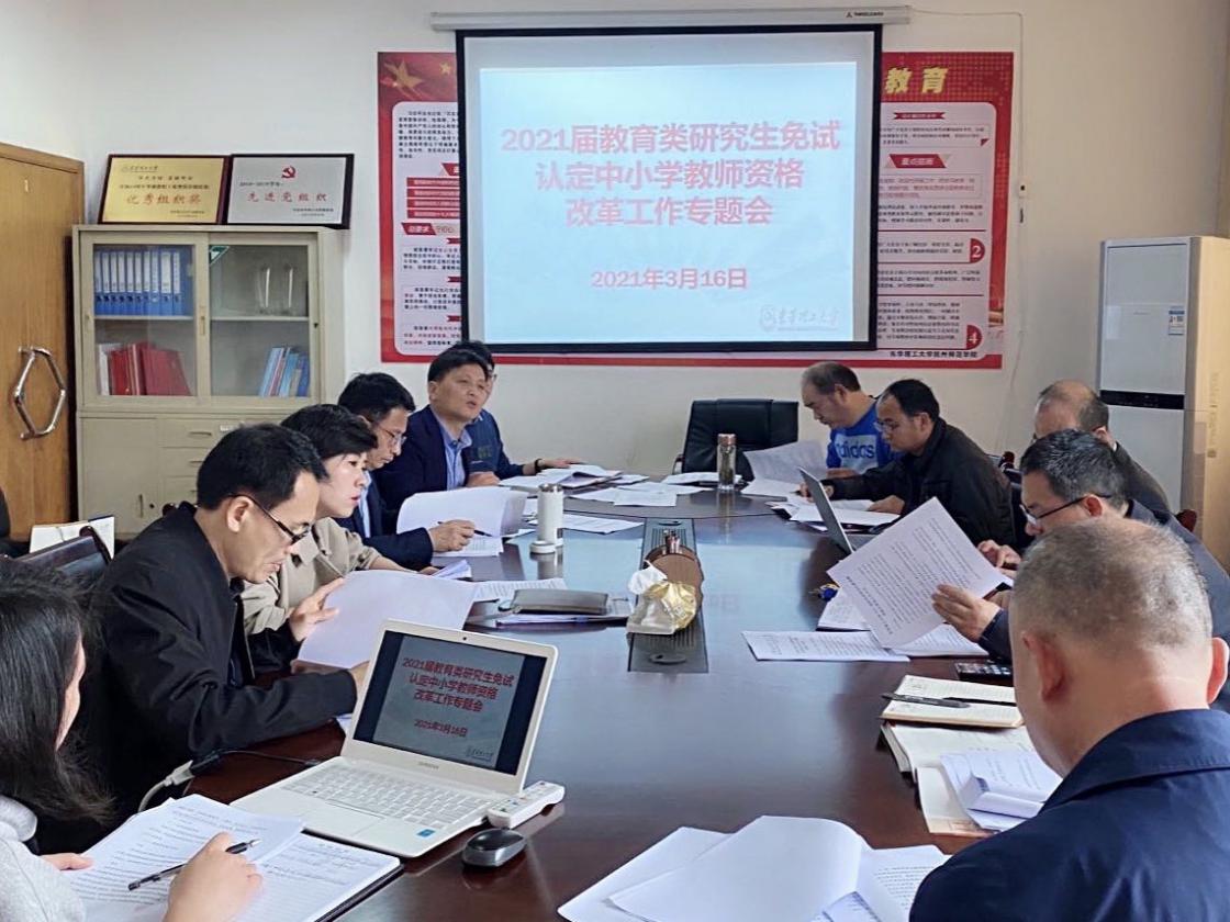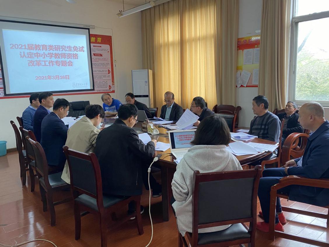 与会人员认真研读了 《关于转发<教育部关于印发<教育类研究生和公费师范生免试认定中小学教师资格改革实施方案>的通知>的通知》(赣教师字[2020]19号)和江西省教育厅办公室文件《关于做好江西省2021届教育类研究生和公费师范生免试认定中小学教师资格改革工作的通知》(赣教师办函[2021]6号)等相关文件,针对考核依据、考核组织工作、考核范围、考核时间、考核内容及形式、考核的要求及注意事项等教育类研究生免试认定中小学教师资格校内考核相关工作进行了深入细致的讨论和研究,并就考核工作办法和具体方案的制订提出了建设性意见。