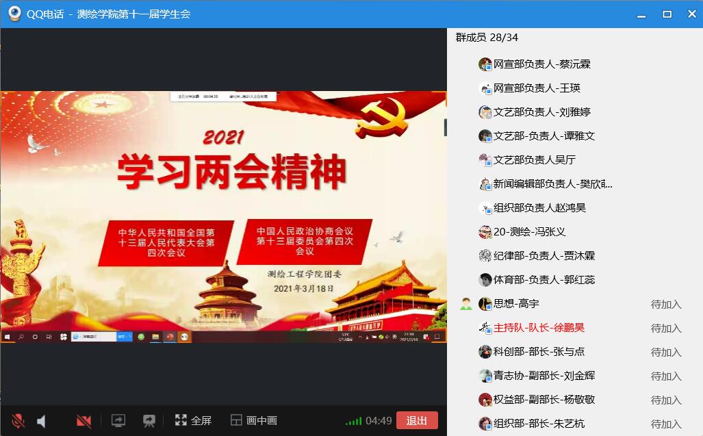 为增强测绘学子对全国“两会”精神的理解,提升服务学生工作意识和工作积极性,2021年3月18日晚,测绘工程学院开展全国“两会”精神线上教育学习。学院学团办老师、团委学生会、青年志愿者协会成员参加了此次会议。