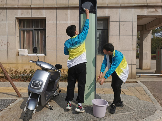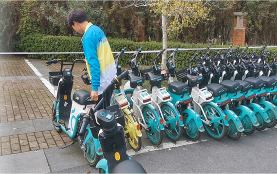 细细观察会发现一处别样的“风景”——总有些许共享电动车凌乱的占据了校园外周边的路旁,无论是远观还是近瞧,摆放的确实杂乱而又无章,除了影响路人行走外,也突兀出些许不文明。党支部汪康同志说“同学们,要不然我们把这些共享单车给摆整齐,放回该属于他们的位置吧!”