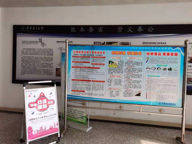 学院展出了消防安全、扫黑除恶、反邪教、防黄赌毒等主题内容海报,并通过LED电子屏、微信公众平台,广泛宣传了消防防火、非法校园贷、电信网络诈骗等安全防范知识。