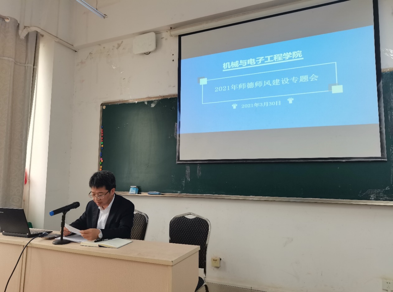 为全面贯彻党的教育方针,完善立德树人体制机制,打造一支高素质的教师队伍,推动学院师德师风建设,2021年3月30日上午,机电学院在409会议室召开了师德师风建设专题工作会,会议由学院党委书记徐鹏程主持,全体教职工参加。
