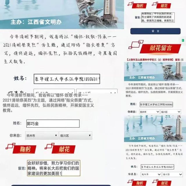 3月26-29日,长江学院人文与艺术系组织全体师生积极参与江西省“文明江西”公众号举办的主题为“缅怀 致敬 传承——2021清明祭英烈”为主题的网上祭扫活动,组织上千名学生参加此次活动。同学们纷纷通过网络向先烈们鞠躬致敬,并用文字表达了自己心中的敬意。