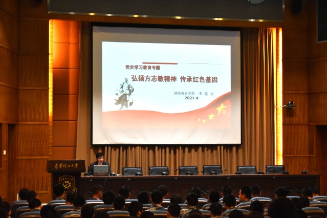 根据《国防教育学院党委党史学习教育计划》,4月13日下午3:30,国防教育学院党委书记李儒俊在学府校区图书馆四楼报告厅为全体海军士官生上《弘扬方志敏精神 传承红色基因》的党史学习专题党课。全体海军士官生到会聆听党课,会议由国防教育学院党政办公室副主任曹燕主持。