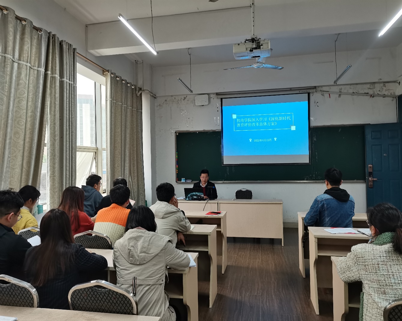 为深入学习中共中央、国务院《深化新时代教育评价改革总体方案》(以下简称《总体方案》),贯彻落实习近平总书记关于教育的重要论述和全国教育大会精神,完善立德树人体制机制,4月13日下午,机电学院组织全体教工学习《总体方案》,院党委书记徐鹏程领学。