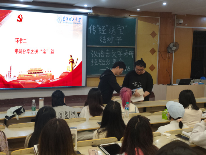 本次交流会分为“传经”“送宝”“结对子”和现场提问四个环节。传“经”即为同学们传递宝贵的学习经验与技巧。现场五位同学倾囊相助,将自己考研过程中的经验和收获分享给在座的同学们,包括选择学校和专业的方法、详细的做题技巧、跨考经验、考研期间心态调节等细节,在场的同学们都受益匪浅,用心记下了笔记。