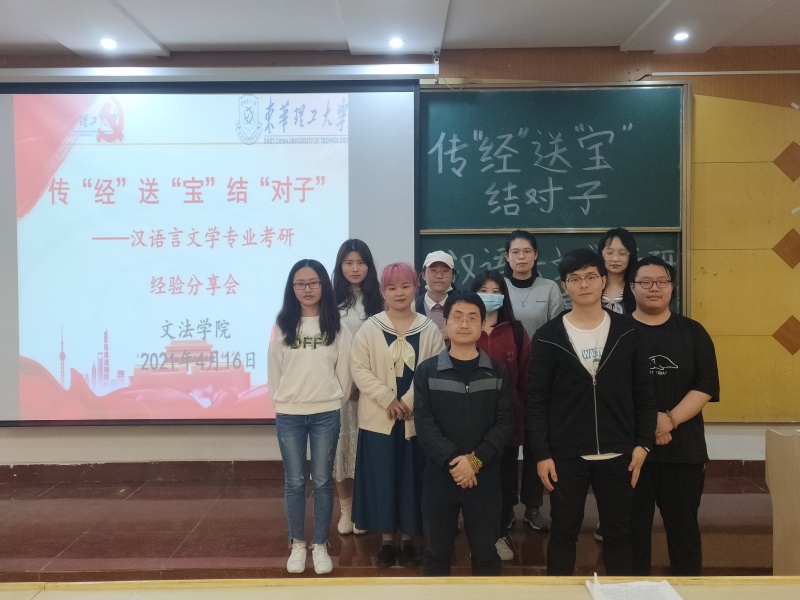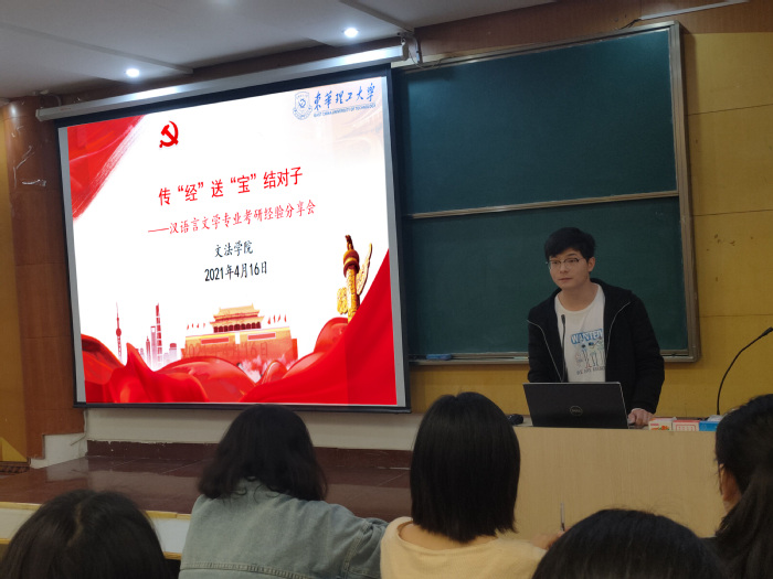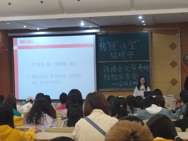 为深入开展党史学习教育,践行“我为群众办实事”,文法学院于2021年4月16日晚在枫林校区图书馆阶二举行了2021届第一场考研经验分享会。本次交流会邀请了汉语言文学专业考研成绩优异的朱佳、彭婧、谢浩昌、吴佳妮、胡晓雯等5位学生党员为师弟师妹们传“经”送“宝”结“对子”,现场分享成功经验、送考研礼包,结考研帮扶对子。200余人到现场参加了分享会,2018级中文系班主任文俊威博士主持了本次分享会。