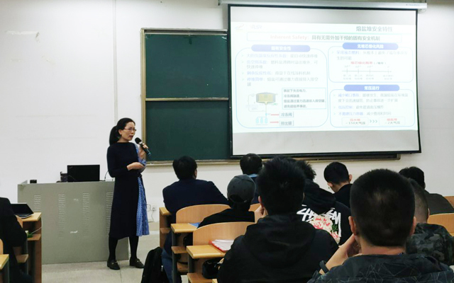会谈结束后,丁鹏基、李露、张建、邹春燕四位专家在地学楼C2教室依次作了题为“基于超短激光脉冲的非线性光学诊断技术”“超快相干极紫外光源的研发、表征与应用”“三离子束原位辐照设施及其在核能材料辐照研究中的应用”“钍基熔盐堆核能系统(TMSR)”的学术讲座,并与参加讲座的学生进行了互动交流,耐心地解答了他们提出的相关问题。最后,专家们还实地参观了学院的核工程技术实验教学中心。