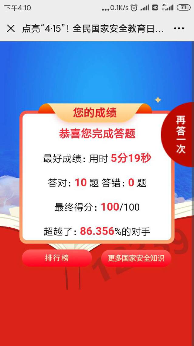 开展一次知识竞赛活动。4月12日至15日,学院组织开展了“点亮“4·15”!江西全民国家安全知识答题”。通过在线知识竞答的形式,加深了同学们对安全知识的了解,增强了理论知识运用于实际生活的能力,提高了自我保护能力。