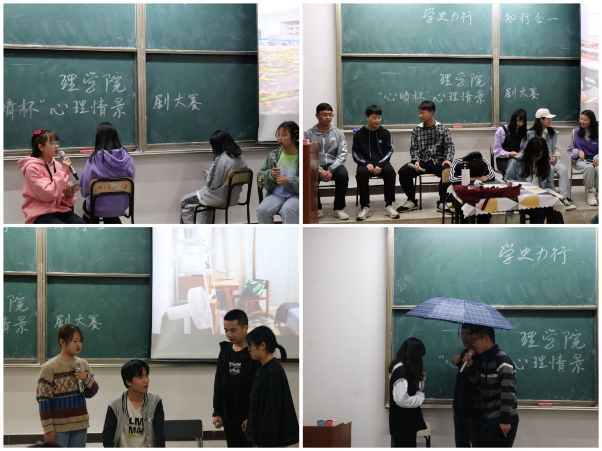 伴随着《歌唱祖国》嘹亮的歌声拉开此次心理情景剧大赛序幕,心理情景剧《流言》以当下大学生线下矛盾冲突转战到线上表白墙的冲突,经过沟通交流找到应对大学生活流言的方式方法和解决心理冲突的办法。《只因为爱》讲述的是一个曾经沉溺于网络高考失败的学生在父母的关心、同学们的关心照顾下逐步转变成优秀的自立自强的当代新青年的故事。《想遇见最好的你》运用照镜子技术和穿越的技巧,讲述了一个内向自卑的学生通过合理情绪疗法以及班级同学的帮助下逐步转变成为自信自强的快乐女生的故事。同学们用精彩纷呈的精彩表演和逼真的表演方式,时不时赢得观众热烈的掌声,给理学院师生带来一场精彩纷呈的视听盛宴,同时起到了良好的心理教育效果。