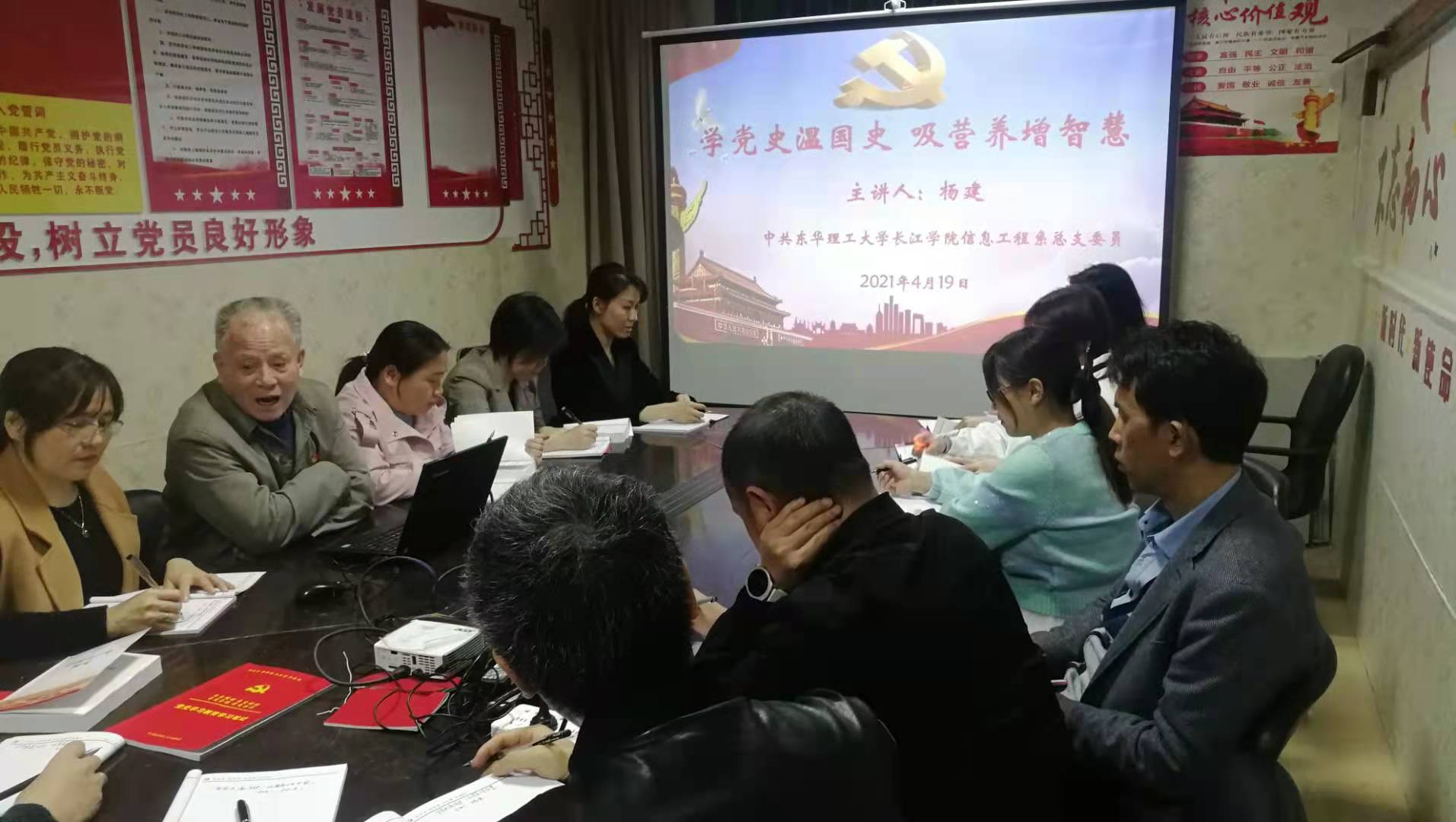 信息工程系党总支为进一步深入贯彻“党史学习”主题教育,特邀请了东华理工大学退休老党员杨建同志,于2021年4月19日晚,在信工楼信息工程系党员活动室101为教工党员上了一堂主题为“学党史温国史,吸营养增智慧”的党课,信息工程系全体教工党员聆听了党课。