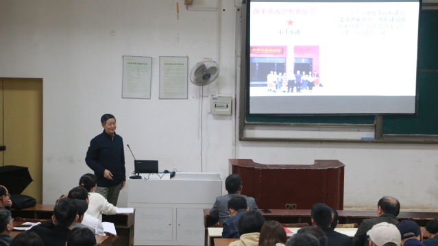 何建华从“工人运动的摇篮”、 “人民军队的摇篮”、“中国革命的摇篮”、“共和国的摇篮”、“改革开放思想的摇篮”五大板块内容带领学院师生回望党史,追忆初心。何建华向师生们介绍了安源路矿工人运动、八一南昌起义、井冈山革命根据地、瑞金中华苏维埃共和国、小平小道等发生在江西红土地上的红色故事和江西地方党史的贡献。他深情动容的论述、信手拈来的详实史料,娓娓道来,深深打动了全体党员教师。