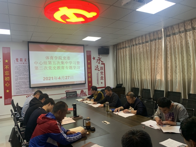 4月27日下午,体育学院党委在体育馆一楼党员活动室召开党史学习教育“新民主主义革命时期历史”专题学习暨党委理论学习中心组第5次学习会(扩大)。学院党委书记张明主持会议,院党委委员、支部书记、科级干部参加学习。