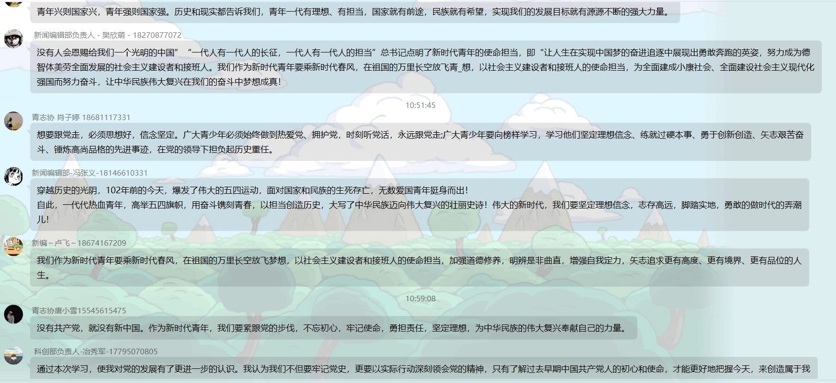 云团课结束,胡佳老师组织团员在群里分享自己对此次直播的感想,同学们感悟最多的便是“我们应该不忘初心,牢记使命,不断开拓创新,砥砺前行,将个人理想与国家发展紧密联系在一起”。