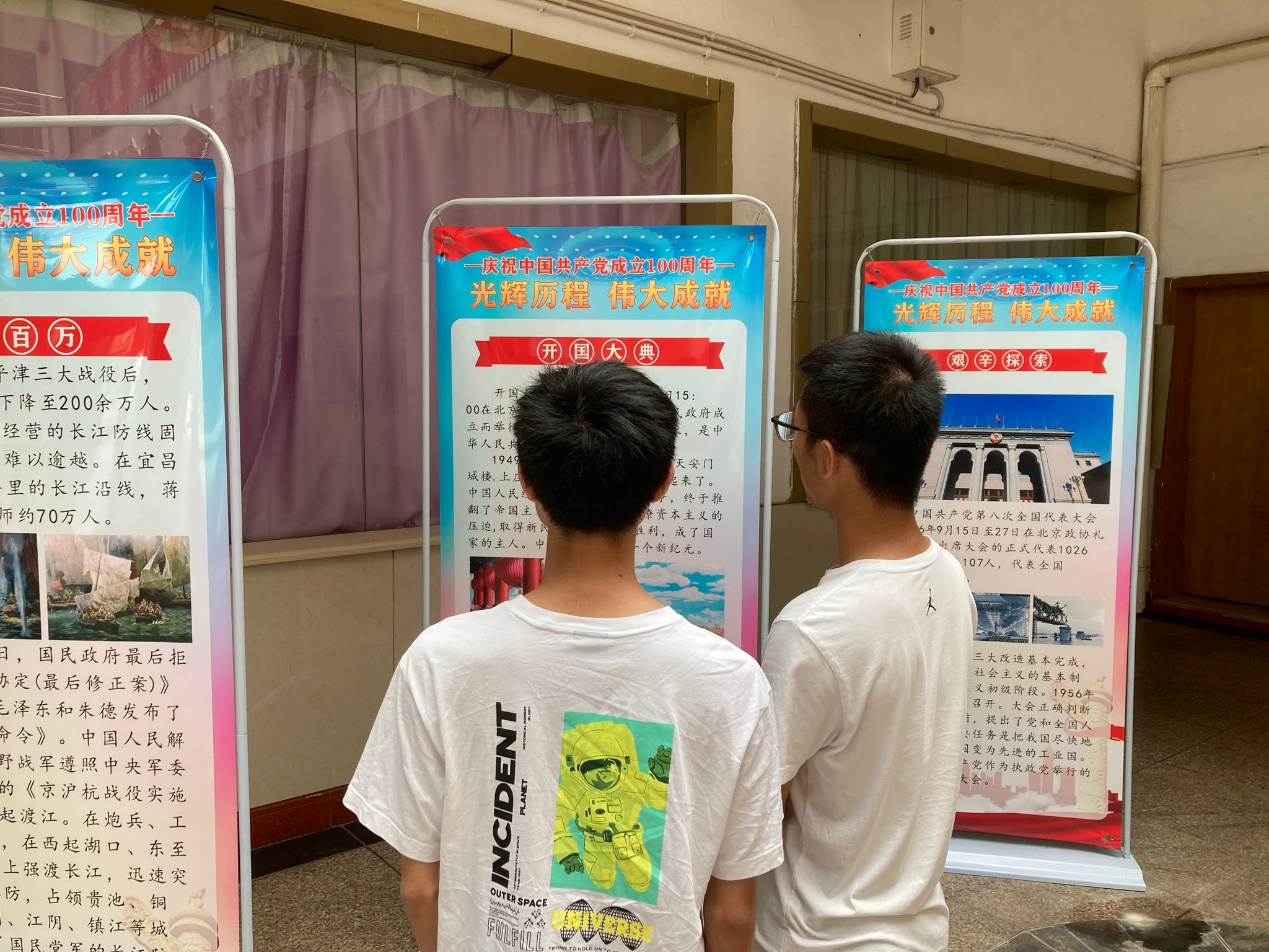经管楼一楼报告厅门前一片以“党的光辉历程”为主题的党史易拉宝整齐排列,其中记载了中国共产党成立一百周年来的光辉历史,主要有“南湖曙光”、“万里长征”、“全面抗战”、“开国大典”、“改革开放”、“伟大强国梦”等篇章。“易拉宝上的内容看下来令我心潮澎湃,也明确了许多自己以前不曾知道或记忆模糊的东西,忘不了革命前辈在硝烟中前仆后继,忘不了无数英雄为祖国解放事业而奋不顾身,曾经的苦难,曾经的悲怆,让人难忘,今天的成就,今天的伟业也让人自豪。”2020级学生张怡豪说。