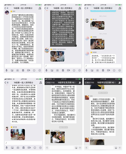 该片生动再现了马克思和他的战友们为人类的解放事业奋斗终生,以及为追求真理不畏艰难险阻的意志力和高尚的人格魅力,讲述了马克思对人类社会进步特别是世界社会主义运动产生的深远影响。在观看完后,同学们被马克思的人生经历深深地震撼了,纷纷在微信和QQ群里发言,谈感想感悟。