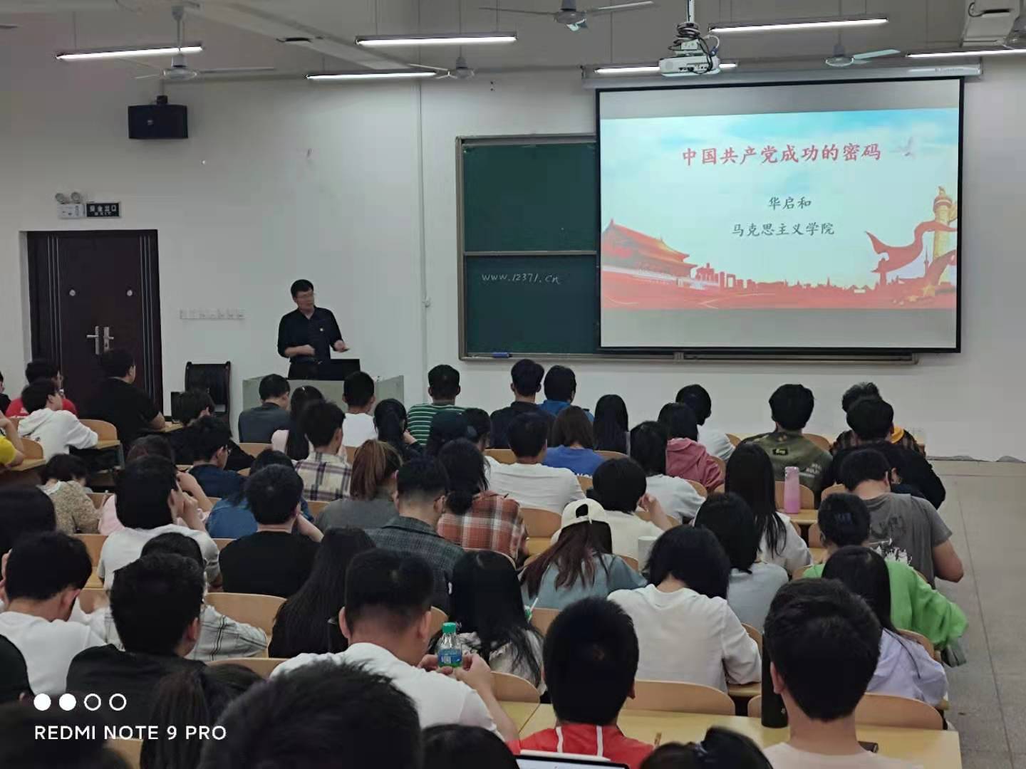 开班仪式结束后,校首批党课讲师团成员、马克思主义学院党委书记华启和教授以《中国共产党成功的密码》为题,从科学的理论指导、坚定的理想信念、彻底的自我革命和坚实的群众基础四个方面带领学员们重温党的历史,探寻中国共产党成功的密码,为学员们提供了一场精彩的思想政治洗礼课。本次党课在学员们经久不息的掌声中顺利结束。
