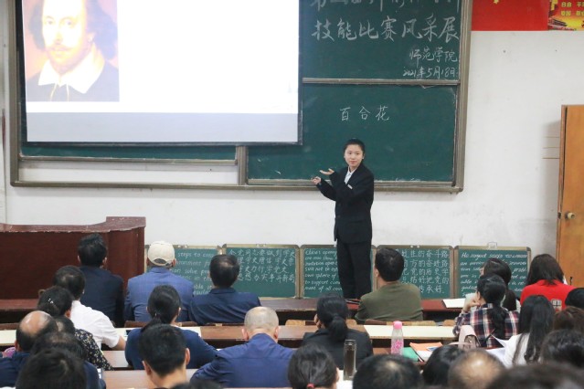 教师技能大赛之“说课+微课”决赛一等奖的18级汉语言专业章敏、18级学前教育专业李菁、18级英语专业丁宇琴和18级数学与应用数学专业高原四位同学分别展示“说课+微课”内容。章敏声情并茂的讲说了《百合花》一课,其展示了战争时期的军民鱼水情,歌颂人性美和人情美,通过讲述小通讯员舍己救人而牺牲的英雄壮举和表现出的强烈的人性至爱和高尚的人格,感染了在场观众;学前教育专业的李菁通过现场小实验和生动的语言,让大家认识了小火苗的危害,极大的活跃了现场气氛,还融入了“星星之火,可以燎原”的党史知识;英语专业的丁宇琴利用专业之长,用一口流利的英语介绍了形式多样、内容丰富的诗歌;高原通过小图形形状与大小的对比带领大家认识了全等三角形,课程内容通俗易懂。四位同学精彩的“说课+微课”展示,赢得了在场热烈的掌声,展现了师范学子的风采,他们的教学技能水平得到了老师们的充分肯定及赞赏。