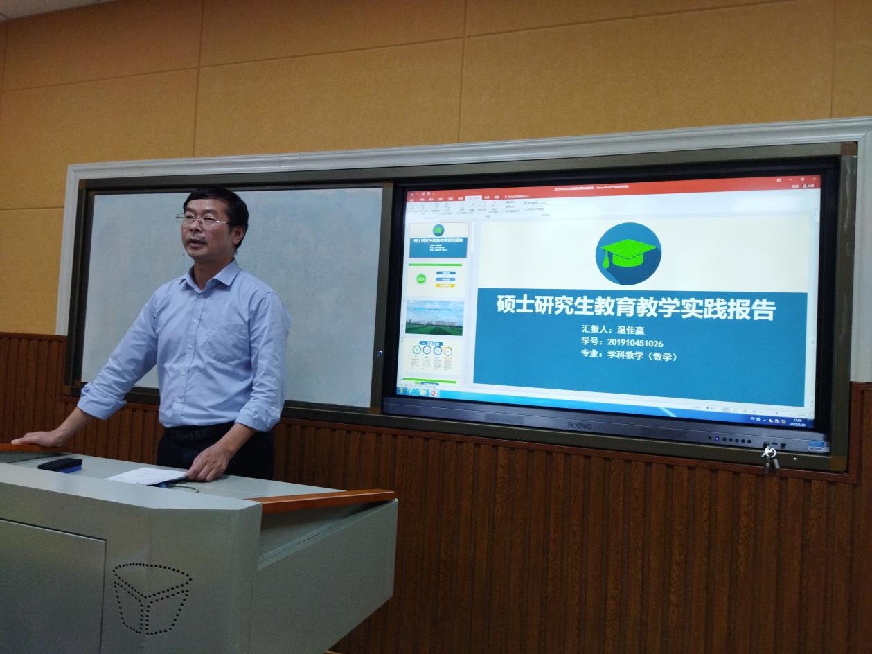 参加本次专业实践汇报的是学科教学(数学)的12名专业硕士研究生,担任此次评委的是6位硕士研究生导师:颜七笙教授、李琪教授、陈火弟副教授、张延飞副教授、许志军副教授、阮周生副教授。