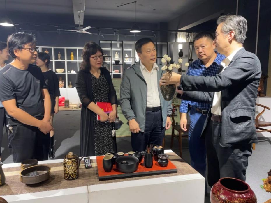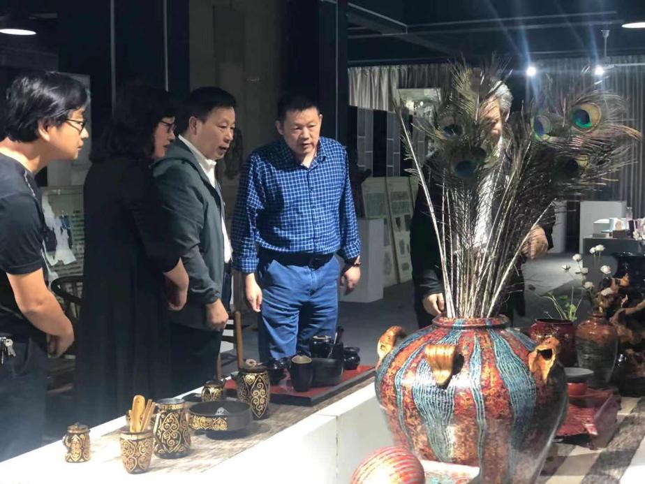 刘紫春重点向指导老师徐涛、王强、马琳琳等详细了解了“赣云漆艺工作坊”作品的制作过程,看到一件件普通的杯、碗、坛、罐、桌、椅、几、案经过漆艺的设计打磨加工脱胎换骨成为光彩照人、典雅别致的艺术品时,他充分肯定了创作团队将艺术融入生活的设计理念,鼓励师生们再接再厉,多出作品,出好作品。刘紫春指出,工作坊作品既体现了传统工艺,又有观念的创新,还能走向市场,重点是和大学生的课程结合在一起,具备很多优势,可在互联网+、挑战杯比赛上力争取得更好的成果。