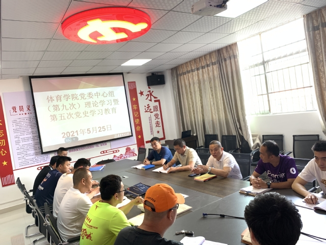 5月25日中午,体育学院党委在体育馆一楼党员活动室召开党史学习教育第5次专题学习暨党委理论学习中心组第9次学习会(扩大)。学院党委书记张明主持会议,院党委委员、支部书记、科级干部参加学习。