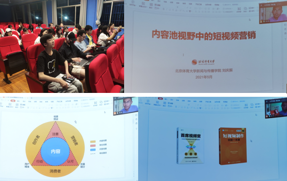 为拓展广告专业学生传播视野,培养广告学生核心素养,2021年5月28日晚,文法学院传播系教工党支部特邀北京体育大学新闻与传播学院刘庆振教授为广告专业学生作了题为“内容池视野中的短视频营销”的专题讲座。传播系教师及学生以线上和线下同时进行的方式参与了此次活动。