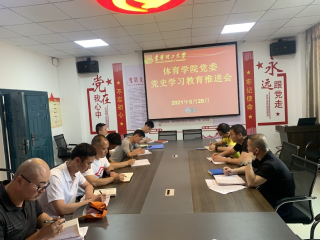 5月28日中午,体育学院党委在体育馆一楼党员活动室召开党史学习教育推进会。学院党委书记张明主持会议,院党委委员、支部书记、科级干部参加学习。